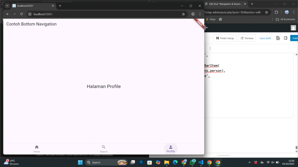 Routing jenis navigator ini menampilkan halaman dengan konsep tumpukan menggunakan animasi transisi ketika berpindah halaman. Untuk berpindah ke halaman baru pada navigator kita menggunakan BuildContext. BuildContext adalah “penanda lokasi” suatu widget di dalam pohon widget (widget tree) Flutter. Seperti pembahasan sebelumnya, pada navigator untuk berpindah halaman kita juga menggunakan push() dan pop().